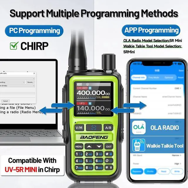 FCC ID: 2AJGM-5RMINI. ^^ APP Programming (model choose 5R mini): You can easily program your radios (channels, frequencies, and other functions) without the need for a computer or programming cable best for beginners, outdoor enthusiasts, and professionals. Support Chirp, choose UV-5R MINI.