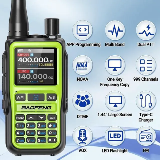 Baofeng UV-5R MINI: Multi band, VHF, UHF, AM, FM, NOAA weather receiver, VOX hands-free, DTMF, 1.44 '' Large Screen, 999 Channels, CTCSS, DCS, etc., USB-C port charger meeting different communication needs. The 5R MINI has a small and lightweight body, suitable for long-term long distance outdoor carrying. CHIRP choose "UV-5R MINI".