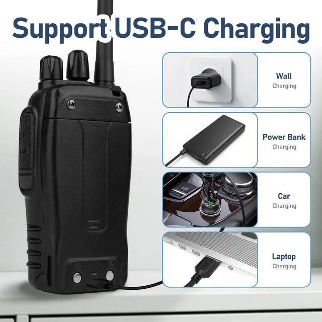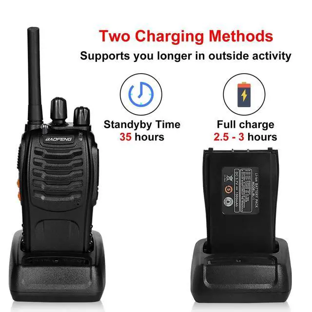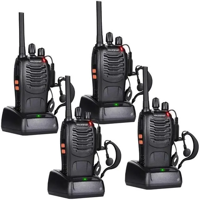 customizable settings: DCS/CTCSS privacy codes, emergency alarm, squelch control, VOX hands-free operation, power-saving mode, and low-battery alerts. Adapts to any scenario! ^^ Long Range Communication Walkie talkies achieve up to 3 miles in open areas and 0.8 - 1.3 miles in urban environments (range varies by obstructions and battery level). Ideal for hiking, construction sites, festivals, and emergency preparedness. ^^ Rechargeable USB-C Port Battery Each BAOFENG BF-888S two-way radio includes a 1500mAh USB-C battery (3-4hr charge time) and charging base. Enjoy 8-96 hours of runtime per charge, depending on usage. Built to last through extended adventures or work shifts. ^^ Package Include - 4 x walkie talkie, 4 x 1500mAh Li-on battery, 4 x charging base, 4 x belt clip, 4 x hand strap, 4 x earpieces, 2 x user mannual ^^ Technical Support - We have a professional technical team that is ready to assist you in resolving any problems. If you encounter any issues while using it, please contact us via. Going to 'Orders' > 'Get help' > select the order > click 'other' > send 'seller' > then send the question