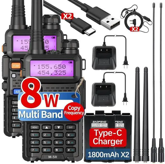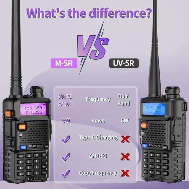 BAOFENG UV-5R Upgrade: M-5R is upgraded of Baofeng UV-5R, 8W high power, multi band, aviation Frequency reception (AM supports manual input and cannot be programmed for writing), FM, one key frequency copy, USB-C charger, 128 channels, 50 CTCSS tones, 210 DCS code, LED flashlights, dual standby, VOX hands-free, keyboard lock, TOT, emergency alarm function, etc. Support CHIRP, select model "5RX".