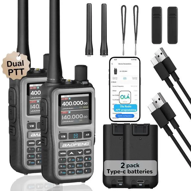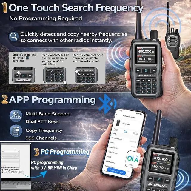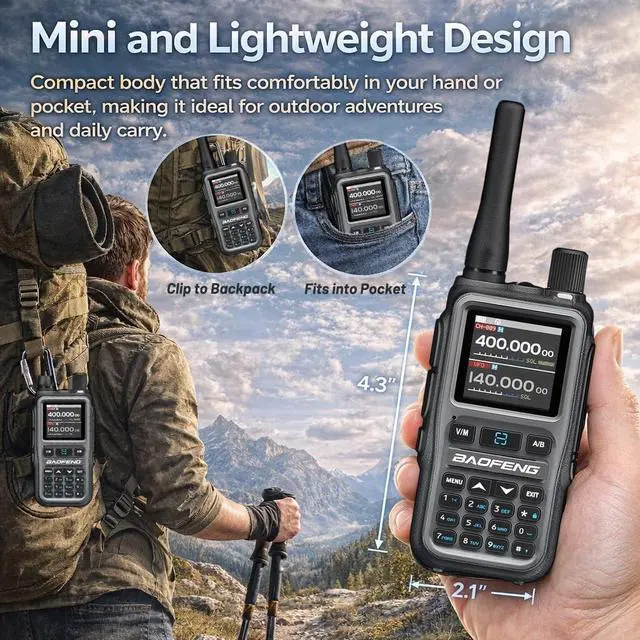 Easy Carry: Designed with portability in mind, this mini and lightweight handheld ham radio features a compact body that fits comfortably in your hand, pocket, backpack, or work vest. The small size makes it easy to carry during hiking, camping, traveling, or daily outdoor activities, without adding extra weight to your gear. The portable design allows you to keep dependable communication within reach whether you're exploring the outdoors, coordinating work tasks, or preparing for emergency situations. ^^ One-Touch Frequency Copy & Smart App Programming: Easily connect with nearby radios using the one-touch frequency search and copy function, allowing you to detect and match frequencies instantly without complicated manual setup. You can also program channels and customize settings through mobile app or PC programming, giving ham radio enthusiasts a faster and more flexible way to configure their radios for outdoor communication and team coordination. ^^ Dual PTT Keys & VOX Hands-Free Communication for Efficient