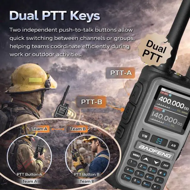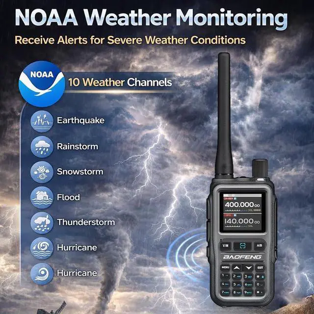 Team Coordination: This handheld ham radio is equipped with dual PTT keys and VOX hands-free communication, providing more flexible and convenient operation during work or outdoor activities. The two independent push-to-talk buttons allow quick switching between channels or groups, helping teams communicate efficiently and coordinate tasks smoothly. With VOX voice-activated transmission, the radio can automatically transmit your voice without pressing any buttons, which is especially useful when hiking, climbing, driving, or working with tools, keeping communication easy and hands-free whenever you need it. ^^ NOAA Weather Monitoring for