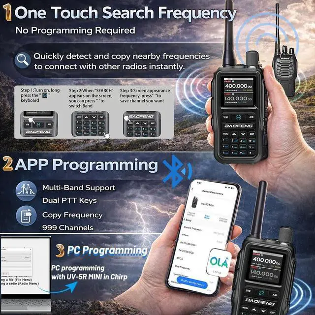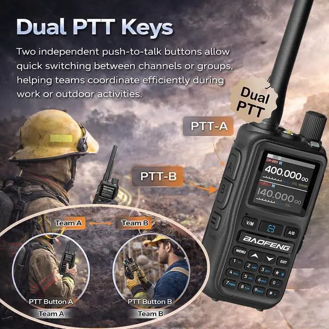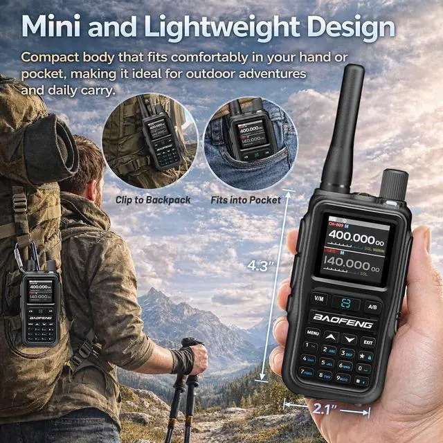 Easy Carry: Designed with portability in mind, this mini and lightweight handheld ham radio features a compact body that fits comfortably in your hand, pocket, backpack, or work vest. The small size makes it easy to carry during hiking, camping, traveling, or daily outdoor activities, without adding extra weight to your gear. The portable design allows you to keep dependable communication within reach whether you're exploring the outdoors, coordinating work tasks, or preparing for emergency situations. ^^ One-Touch Frequency Copy & Smart App Programming: Easily connect with nearby radios using the one-touch frequency search and copy function, allowing you to detect and match frequencies instantly without complicated manual setup. You can also program channels and customize settings through mobile app or PC programming, giving ham radio enthusiasts a faster and more flexible way to configure their radios for outdoor communication and team coordination. ^^ Dual PTT Keys & VOX Hands-Free Communication for Efficient