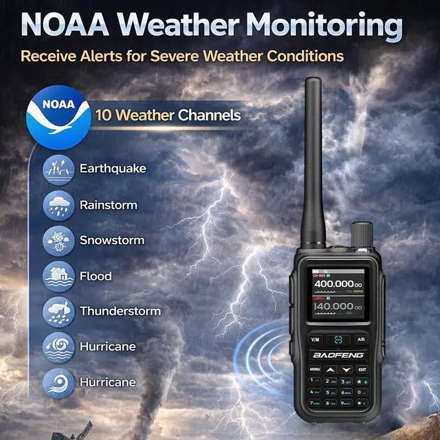 Team Coordination: This handheld ham radio is equipped with dual PTT keys and VOX hands-free communication, providing more flexible and convenient operation during work or outdoor activities. The two independent push-to-talk buttons allow quick switching between channels or groups, helping teams communicate efficiently and coordinate tasks smoothly. With VOX voice-activated transmission, the radio can automatically transmit your voice without pressing any buttons, which is especially useful when hiking, climbing, driving, or working with tools, keeping communication easy and hands-free whenever you need it. ^^ NOAA Weather Monitoring for