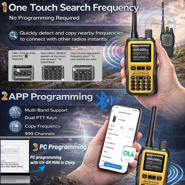 • One-Touch Frequency Copy & Smart App Programming: Easily connect with nearby radios using the one-touch frequency search and copy function, allowing you to detect and match frequencies instantly without complicated manual setup. You can also program channels and customize settings through mobile app or PC programming, giving ham radio enthusiasts a faster and more flexible way to configure their radios for outdoor communication and team coordina