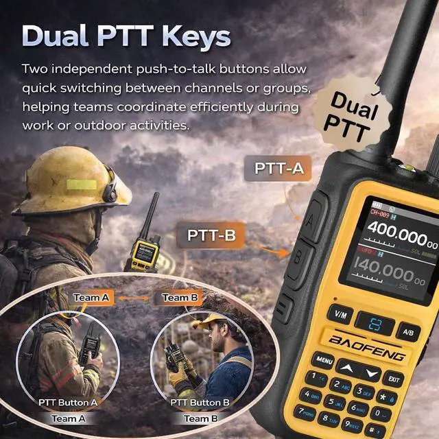 Easy Carry: Designed with portability in mind, this mini and lightweight handheld ham radio features a compact body that fits comfortably in your hand, pocket, backpack, or work vest. The small size makes it easy to carry during hiking, camping, traveling, or daily outdoor activities, without adding extra weight to your gear. The portable design allows you to keep dependable communication within reach whether you're exploring the outdoors, coordinating work tasks, or preparing for emergency situations. ^^ One-Touch Frequency Copy & Smart App Programming: Easily connect with nearby radios using the one-touch frequency search and copy function, allowing you to detect and match frequencies instantly without complicated manual setup. You can also program channels and customize settings through mobile app or PC programming, giving ham radio enthusiasts a faster and more flexible way to configure their radios for outdoor communication and team coordination. ^^ Dual PTT Keys & VOX Hands-Free Communication for Efficient