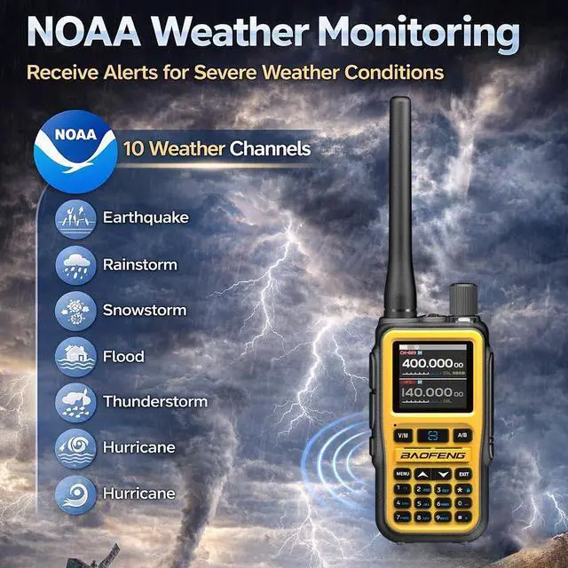 Team Coordination: This handheld ham radio is equipped with dual PTT keys and VOX hands-free communication, providing more flexible and convenient operation during work or outdoor activities. The two independent push-to-talk buttons allow quick switching between channels or groups, helping teams communicate efficiently and coordinate tasks smoothly. With VOX voice-activated transmission, the radio can automatically transmit your voice without pressing any buttons, which is especially useful when hiking, climbing, driving, or working with tools, keeping communication easy and hands-free whenever you need it. ^^ NOAA Weather Monitoring for