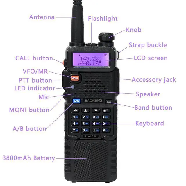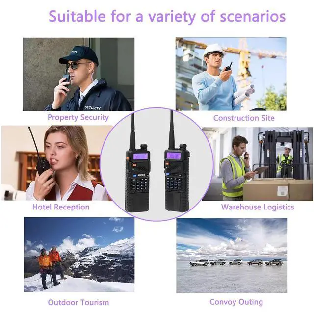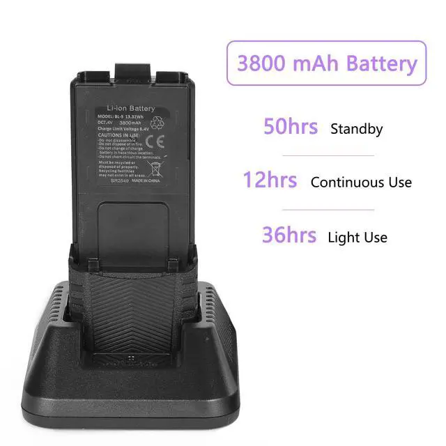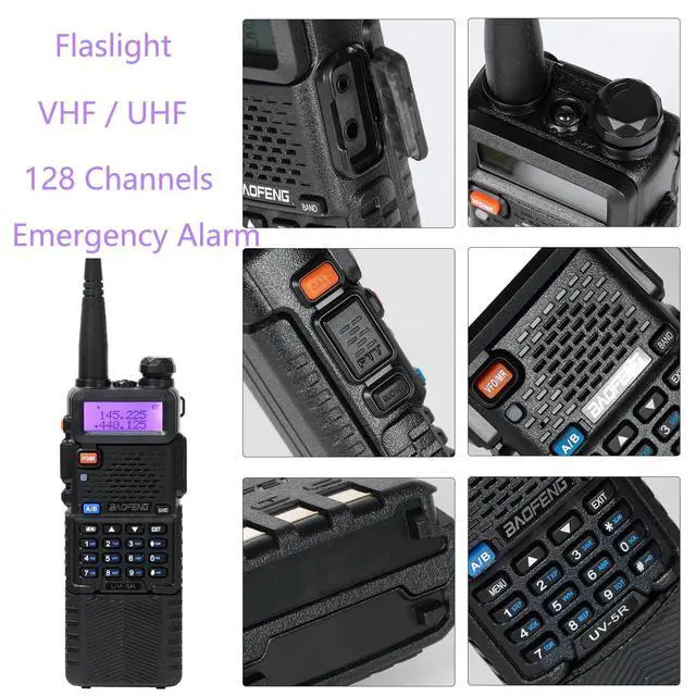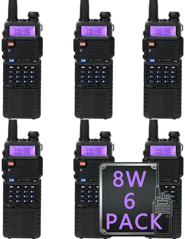 Baofeng radio frequency band: VHF/UHF ^^ bands and channel name displayed ^^ Up to 128 memory channels ^^ Squelch adjustable in 9 levels ^^ Setting and storing of channel names ^^ UV-5R ham radio 8 watt, 50 CTCSS tones and 210 DCS codes ^^ SOS Emergency function ^^ LCD display with backlight adjustable in 3 colors ^^ VOX, Scan, Dual Watch functions ^^ Repeater shift ^^ Walkie Talkies, VOICE: vocal indication of the function selected ^^ Channel or frequency mode selection ^^ Power Save ^^ TOT (Time out timer) ^^ Busy Channel Lockout function (BCL) ^^ Two way radio, DTMF function ^^ Reverse function ^^ Alarm function ^^ CTCSS and DCS codes research. If you have any questions, please feel free to contact us via ^^ What's in the box? 6 x BAOFENG UV-5R 8W radio with antenna, 6 x 3800mAh Li-Ion battery, 6 x Headset, 6 x Charger, 6 x Belt clip, 6 x Hand strap, 1 x English manual