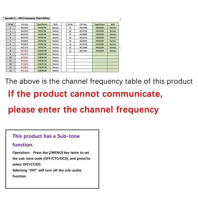 This is a necessity for life safety. ^^ Long time standby and durability The walkie talkie is equipped with 1400mah battery, which supports long time standby. The charging port adopts Type-c charging, which is more convenient and can be charged through PC, car or charging bank. So you don't need to buy and discard batteries repeatedly. ^^ Multi-scene applicationWalkie talkies long range can reach 3 miles in open areas. If there are buildings, the working range will be reduced. Two way radio for adults, palm-sized, strong material and resistant to falling, rain-proof, very suitable for various application scenarios such as: road trip, warehouse, cruise ship, outdoor picnic, camping, riding, hotel management, warehouse, building construction, restaurant, school Playground and church. ^^ What you getPackage contains (walkie talkie, belt clip, hand strap, battery ) X 2 and 2 in 1 Type-C charger X1, user manual X1. Easy to operate, suitable for novices, and provide technical guidance. All day customer service replies to ensure your purchase enjoyment. ^^ This product has a Sub-tone function. If the product does not match, please turn off the Sub-tone function Operation Press the [/MENU] key twice to set the sub-tone code (OFF/CTC/DCS), and press/to select OFF/CT/DC. Selecting "OFF" will turn off the sub-audio function. (