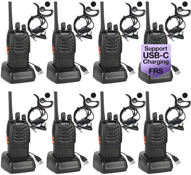 Included: 8 x BF-88A frs radios8 x Desktop USB charger8 x Rechargeable 1500mAh li-ion battery with Type-C port8 x Hand strap8 x Belt clip8 x Earpiece1 x User manual