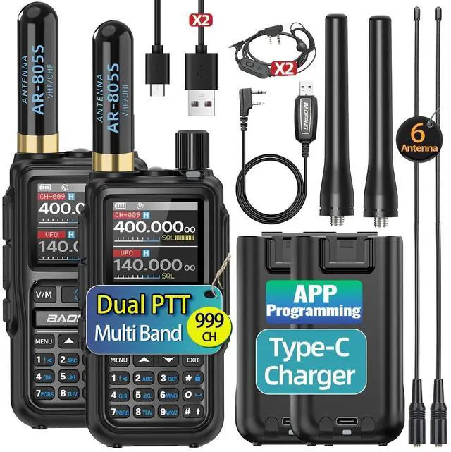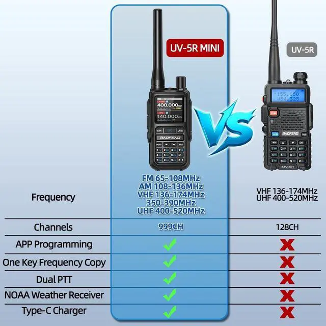 BAOFENG UV-5R MINI: Multi band, VHF, UHF, AM, FM, NOAA weather receiver, VOX hands-free, DTMF, 1.44 '' Large Screen, 999 Channels, CTCSS, DCS, etc., USB-C port charger meeting different communication needs. The 5R MINI has a small and lightweight body, suitable for long-term long distance outdoor carrying. CHIRP choose "UV-5R MINI".