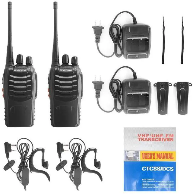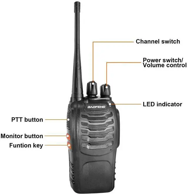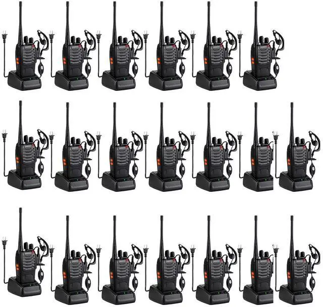 Functions: 1.16 channels 2.50 CTCSS/105 CDCSS 3.1500 mAh Li-ion battery4. Emergency Alarm5. Intelligent Charging6. Battery Save7. Low Voltage Alert8. Time-out Timer9. Flash LightWhat's in the boxBF-888S pack of 20( 2PCS in one box. )20 X BF-888S Portable radios with battery20 X Straps20 X Charger20 X Belt clip20 X Headphone10 X User's manual