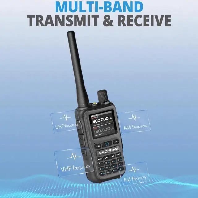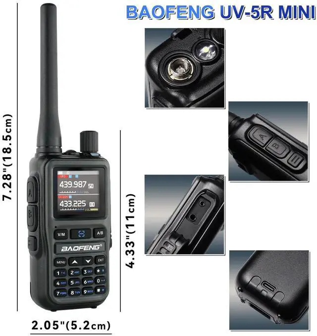 Baofeng UV-5R MINIDual PTT transmitter;6-Band receiving; UHF;VHF;999 Memory Channel; DTMF,FM Radio,AM Radio,NOAA Weather Radio,1.44'' Large Screen;SOS Emergency; Scan;Emergency Alarm;VOX Mode for Hands-Free;High / low power selection; A/B band independent operation; One-click frequency pairing, easy pairing and grouping;Battery allows direct charging from the Type C port.FCC ID: 2AJGM-5RMINI