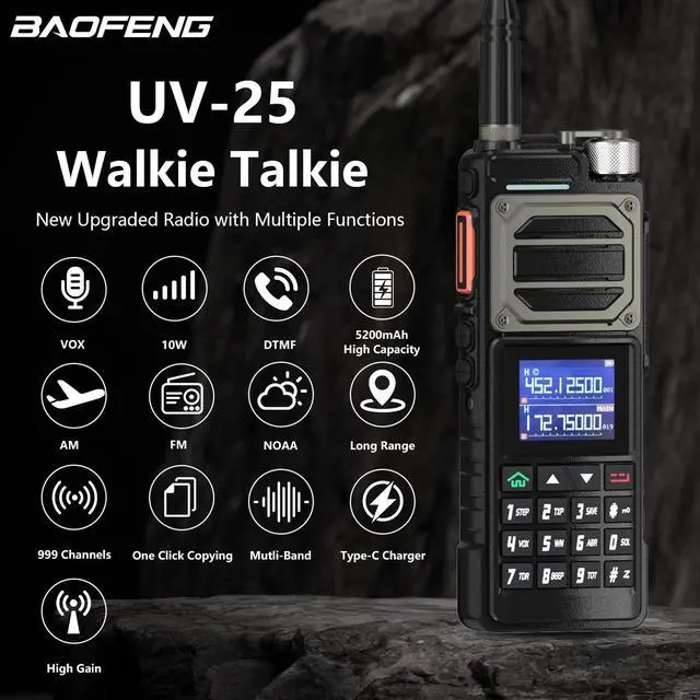 144-148MHzUHF: 420-450MHzQuickly copy frequency in a short period of time, making it more convenient and efficient. Type-C charging is a trend for mobile devices as it has low requirements for power sources and places. The UV-25 is Type-C USB rechargeable, for which you can easily charge it like a phone in your car, with a power bank or laptop. Portable for your go-kit. Apart from programming the radio via computer software, users can also use the keypad to program most settings in the menu, for example, adding/deleting a memory channel, adding/removing a channel from the scanning list, adjustingv VOX/squelch/power save levels, etcCompatible with SMA-Female antennaEspecially with ABBREE tactical antenna will be better. Compatible with K-port (2 Pin) headset, speaker mic, programming cable. Various placeswidely Used, Outdoor/Engineering/warehousing/LogisticsNew choices in the service industry 1 year warranty provided only through "Shiqun Electronics Co., Ltd". If you have any problems with compatible models, please feel free to reach out.