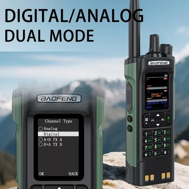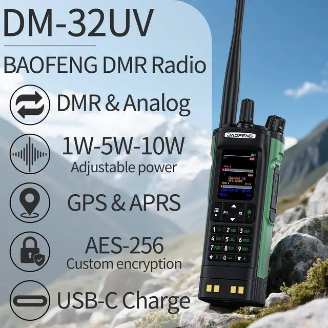 1. 10W High Power & Dual-Band Coverage BAOFENG DM-32 DMR Radio with 10W output ensures stable communication in extreme environments. Its dual-band (VHF/UHF) supports 144-148MHz/430-440MHz TX frequencies, penetrating urban buildings and mountainous terrains for reliable emergency response ^^ 2. DMR AES256 Encryption & APRS Auto Positioning Military-grade AES256 encryption on DM-32 Digital Radio protects sensitive data, while GPS/BeiDou APRS auto-reporting shares real-time coordinates during outdoor adventures ^^ 3. Dual-Channel Monitoring & Smart SMS Function DM-32 Dual Band Radio monitors VHF/UHF simultaneously, with 128-character SMS supporting cross-brand communication. Ideal for construction teams requiring multi-task coordination ^^ 4.