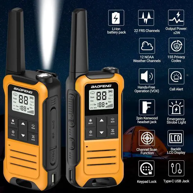 ID: 2AJGM-F22. Baofeng F22 have FRS 22 channels, 50 CTCSS privacy codes and 105 DCS privilege codes. You can set your own main channel and privacy code without worrying about being disturbed. When the walkie-talkie on the same channel and privacy code, you can communicate with other brands FRS radios. ^^ Multi-functionThe flashlight can meet your night lighting, the portable frs radio has weather alarm, which is suitable for your outdoor travel, and also has 22 channels, 12 NOAA channels, dual monitoring mode, channel scanning, 155 privacy codes, call function and 8 ring tone options, VOX hands-free function and HD audio quality, as well as Keypad Lock, Backlit LCD Display, Low Battery Audible Alert, 2Pin Kenwood headset jack, Type-C USB connector for charging. ^^ Long time standby and durability The walkie talkie is equipped with 1400mah battery, which supports long time standby. The charging port adopts Type-c charging, which is more convenient and can be charged through PC, car or charging bank. So you don't need to buy and discard batteries repeatedly. If it cannot be turned on, please charge the walkie-talkies before using it.