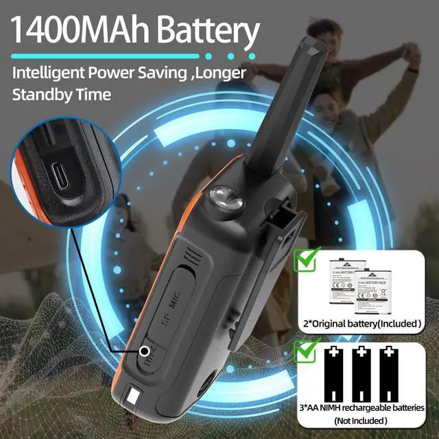 ^^ NOAA Weather Alert The adult two-way radio supports NOAA weather service. It can scan 12 NOAA Weather channels. When you turn on the weather alarm function, the two-way radio will give an alarm if there is a risk of bad weather. Gives you plenty of time to deal with disasters such as Tornadoes, Hurricanes, Floods, Thunderstorms, Earthquakes, etc. ^^ Multi-scene applicationTwo way radio for adults, palm-sized, strong material and resistant to falling, rain-proof, very suitable for various application scenarios such as: road trip, warehouse, cruise ship, outdoor picnic, riding, camping, hotel management, warehouse, building construction, restaurant, school Playground and church. ^^ What you getPackage contains (walkie talkie, belt clip, hand strap, battery ) X 6and user manual X3, 2 in 1 Type-C Charger X3.