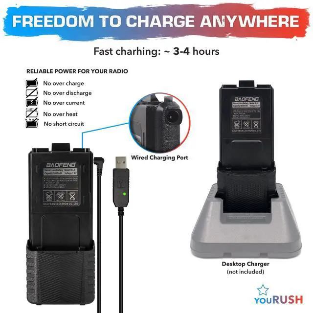 Freedom To Charge Anywhere: Quick and versatile charging via a desktop Baofeng charger, or a high quality USB Charging Cable with a light indicator to connect reliably your BAOFENG BF-F8HP battery radio to power socket, car adapter, power bank, or laptop ^^ BAOFENG extended battery