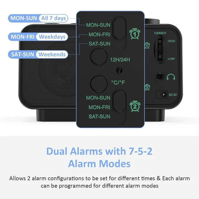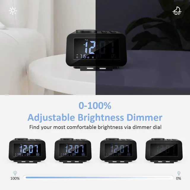 FULL DIMMABLE DISPLAY - The brightness of the 3.4 -inch compact LCD is dial-controlled and adjustable from 0 to 100%, from cast-no-glow at midnight to bright enough that the time can easily be read from across the room during the day. Other features displayed on the screen include: day, 12 or 24hr mode, temperature (F or C), status and ringtone for alarm 1 and 2. ^^ CUSTOMIZABLE ALARM - Dual alarms with separate weekend/weekday/all-7-day mode satisfy the needs of everyone and every family. You may choose one of the 5 built-in tones (Beep/Piano/Buzzer/Bird/Soft Music) or radio as wake up sound, which gradually increases in volume from gentle to the level you set (options from level 1 to 15). Snooze allows extra 9 minutes of slumber. ^^ MORE THAN JUST AN ALARM - FM radio saves up to 40 stations, and the sleep timer function (10-150min) offers the luxury to fall asleep with your favorite station playing. 3.5 mm headphone jack comes handy not disturbing others nearby. 2 USB ports will charge your phone or other mobile devices while you sleep. (Headphones and charging cable NOT included). ^^ QUICK AND EASY TO SETUP - Unique designed large rotary button as a dial, making setting time/alarm easier and faster. All buttons and dials are clearly labeled with function or icon, and everything is clearly displayed on the screen. So it is a breeze to use right out of the box and change settings.