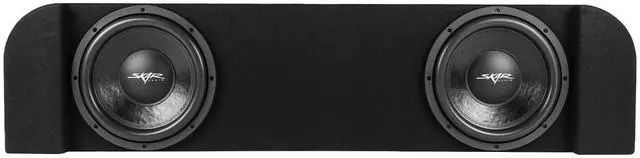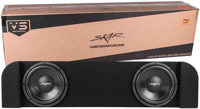 Dual 12-inch 1, 600 Watt Max Power Down-firing Loaded Subwoofer Enclosure ^^ Compatible with 2014-2018 Chevy Silverado/GMC Sierra Crew Cab Trucks (Fits under Rear Seat of Cab) ^^ Features x2 Skar Audio VD-12 D4 (dual 4-ohm) 12" 800 Watt Max Power Subwoofers ^^ Subwoofers Come Loaded and Pre-wired to a 1-ohm Final Impedance Load at the Terminal Wiring Cup ^^ Deep & Responsive Bass Output ^^ Finished in a Premium Automotive Grade Black Trunk-liner Carpeting