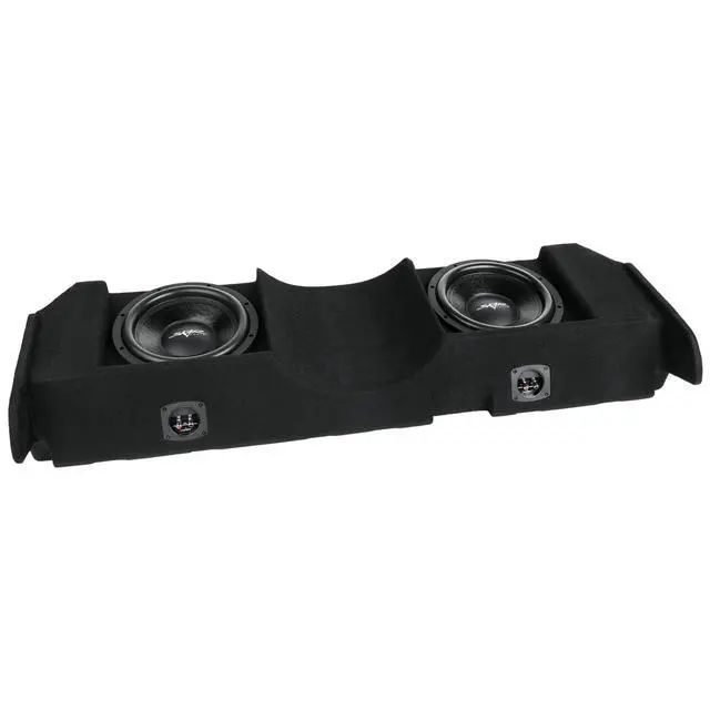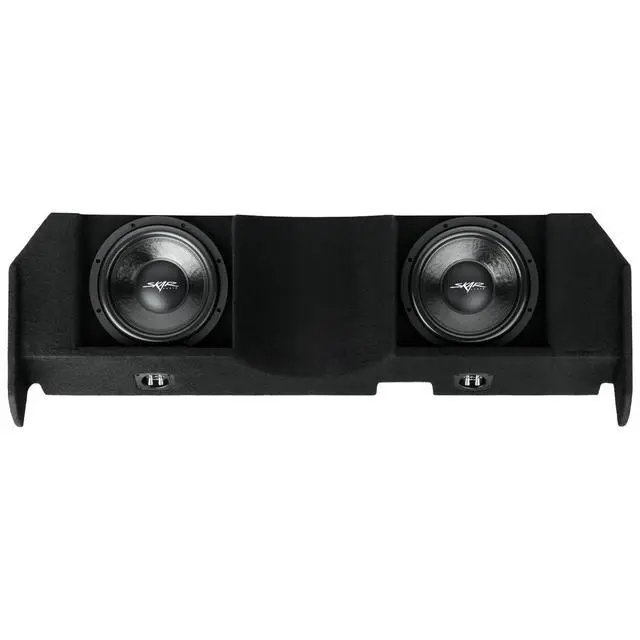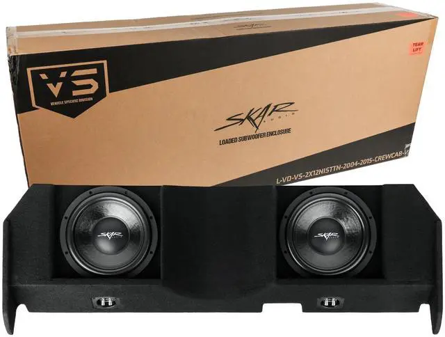 Dual 12-inch 1, 600 Watt Max Power Ported Down-firing Loaded Subwoofer Enclosure ^^ Compatible with 2004-2015 Nissan Titan Crew Cab Trucks ^^ Features x2 Skar Audio VD-12 D4 (dual 4-ohm) 12" 800 Watt Max Power Subwoofers ^^ Subwoofers Come Loaded and Pre-wired to a 2-ohm Impedance Load at each Terminal Wiring Cup (1-ohm Final Impedance Load at Amplifier) ^^ Deep & Responsive Bass Output ^^ Finished in a Premium Automotive Grade Black Trunk-liner Carpeting