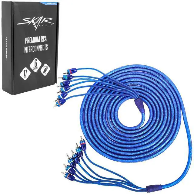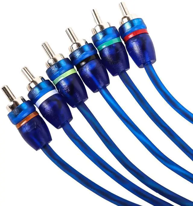 17 Ft 6-Channel Audiophile Grade RCA Interconnect Cable ^^ Utilizing 99.99 % Oxygen Free Multi-Strand Copper Wire Construction ^^ Featuring Twisted Pair Technology For Maximum Signal Transfer ^^ Matte Blue Finish with Max Flex Jacket for Ultimate Wire Flexibility