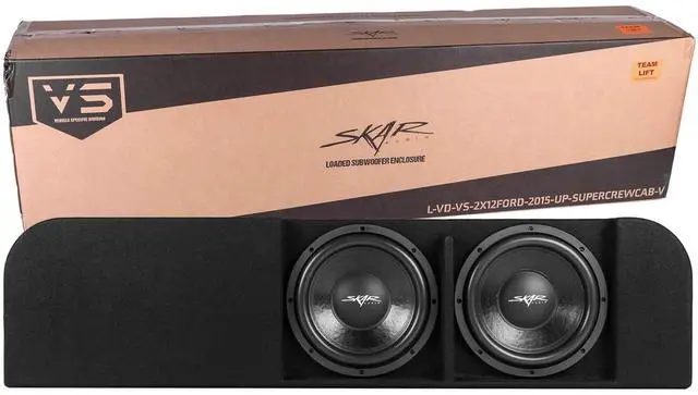 Dual 12-inch 1, 600 Watt Max Power Down-firing Loaded Subwoofer Enclosure ^^ Compatible with 2015-2025 Ford F-150 SuperCrew Cab Trucks (Fits under Rear Seat of Cab) ^^ Features x2 Skar Audio VD-12 D4 (dual 4-ohm) 12" 800 Watt Max Power Subwoofers ^^ Subwoofers Come Loaded and Pre-wired to a 1-ohm Final Impedance Load at the Terminal Wiring Cup ^^ Deep & Responsive Bass Output ^^ Finished in a Premium Automotive Grade Black Trunk-liner Carpeting