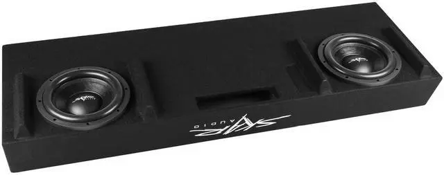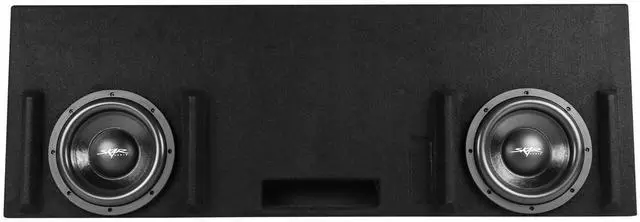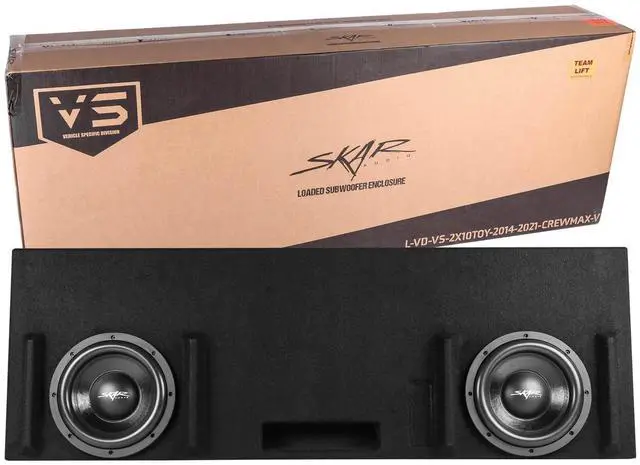 Dual 10-inch 1, 600 Watt Max Power Ported Front-firing Loaded Subwoofer Enclosure ^^ Compatible with 2014-2021 Toyota Tundra Crew Max Cab Trucks (Fits behind Rear Seat of Cab) ^^ Features x2 Skar Audio VD-10 D4 (dual 4-ohm) 10" 800 Watt Max Power Subwoofers ^^ Subwoofers Come Loaded and Pre-wired to a 1-ohm Final Impedance Load at the Terminal Wiring Cup ^^ Deep & Responsive Bass Output ^^ Finished in a Premium Automotive Grade Black Trunk-liner Carpeting