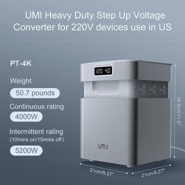 Voltage Converter CenterUMI 110v to 220v converter powers up multiple devices with one item. The ultimate all-in-one solution for voltage conversion. Innovative 6 Outlets Design Beyond the Ordinary, Convenience Redefined. ^^ Full PowerUMI 110v to 220v converter has an intermittent rating of 5.2KW (5mins on/15mins off) and a continuous rating of 4000W. Unlike other compact or bulky voltage converters that claim 3000W but only support 2400W, or 2000W but work with 1600W, the voltage converter reliably powers devices up to 4000W. ^^ Multi-Protections The step up converter has Over-power protection, Over-temperature protection (105C), Alarm protection, Surge protection, Short circuit protection and Leakage protection.
