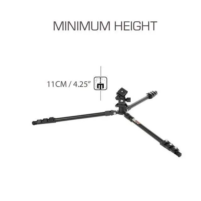 The tripod's legs offer three optimal angles 23 degrees, 55 degrees, and 80 degrees enabling you to shoot from a variety of heights. The widest angle allows for shooting as low as 11 cm ( 4.25 inches), perfect for capturing ground-level shots. Additionally, the tripod's canopy includes a convenient 1/4"-20 screw thread, idea