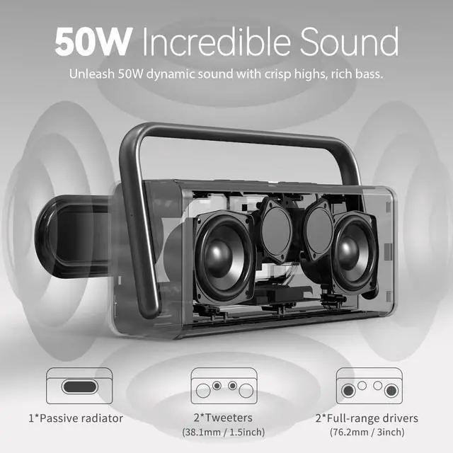 Powerful Sound: Equipped with dual 15W full-range drivers and dual 10W tweeters, this speaker delivers 50W of premium sound with clear treble and rich bass, filling every room in your home with vibrant audio.
