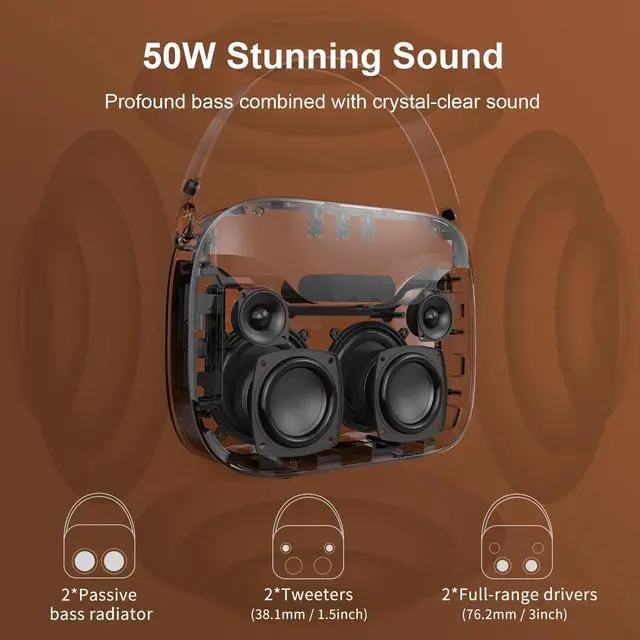 Superior Sound: Equipped with dual 15W full-range drivers, dual 10W tweeters, and dual passive radiators, this speaker offers an impressive 50W of well-balanced sound with clear highs, lush mids, and deep bass.