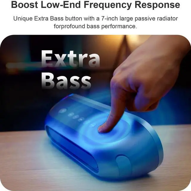 • Punchy Bass: This innovative design features a backside passive radiator, maximizing the speaker's surface area to boost sound pressure for deeper, richer bass with minimal distortion. Just press the Extra Bass button to enhance low-end frequencies, elevating your music experience to new heights.
