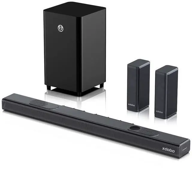 Powerful 500W Output Experience immersive 7.1. 4 surround sound with 500W peak power, delivering crisp highs, deep bass, and theater-like audio for your TV and movies. ^^ Dolby Atmos & Up-Firing Speakers Equipped with Dolby Atmos technology and sky channel speakers for true 3D surround, creating a cinematic soundstage in your living room. ^^ Wireless 8'' Subwoofer Enjoy booming bass with the 130W wireless subwoofer, designed to deliver rich low frequencies without messy cables, perfect for music and action scenes. ^^ Multiple Connections Supports HDMI ARC/HDMI IN, Optical, USB, AUX, and Bluetooth 5.3, ensuring seamless compatibility with TVs, projectors, gaming consoles, and more.