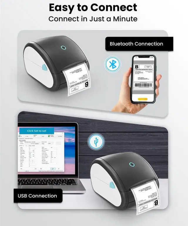 Easy to connect & print - This shipping label printer bluetooth can print via the Bluetooth function of the mobile phone, and also supports USB connection to the computer for printing. Just download the "Ezlabel" APP, and then connect the Bluetooth signal of the bluetooth thermal printer to print, supporting iOS & Android. For a USB connection to the computer for printing, you need to install the print driver, and then spend a minute setting up the printing program to start printing, supporting Windows Mac OS Linux ChromeOS.