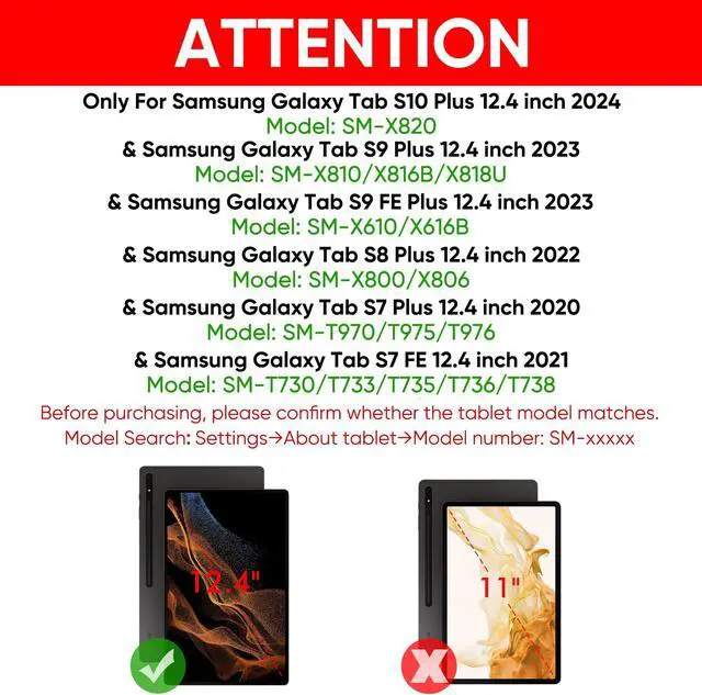 Adaptation Model-Only compatible with 12.4 inch Samsung Galaxy Tab S9+/S9 plus (Model SM-X810/X816B/X818U)and Samsung Galaxy Tab S8+/S8 Plus (Model SM-X800/X806/X808) 2022 and Samsung Galaxy Tab S7+/S7 Plus (Model SM-T970/T975/T976/T978) 2020 ,Samsung Galaxy Tab S7 FE 5G (Model SM-T730/T733/T735/T736/T738) 2021,Samsung Galaxy Tab S9 FE+ 2023 (Model SM-X610N/X616B).Easy to carry anywhere,transform your Samsung Tablet into a laptop within a second.