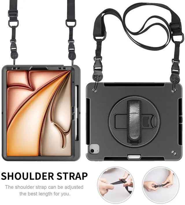 Junfire Protective Case for iPad Air 6th Generation M2 13-inch 2024, Shockproof Rugged iPad A2898 A2899 A2900 Case, iPad Air13 Case with Kickstand/Hand Strap/Shoulder Strap/Stylus Holder-Black