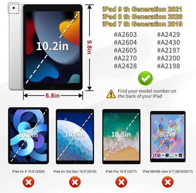 Compatible Models:iPad 10.2 inch (2021/2020/2019,9th/8th/7th,)Model Number: A2602/A2603/A2604/A2605/A2270/A2428/A2429/A2430/A2197/A2198/A2200.