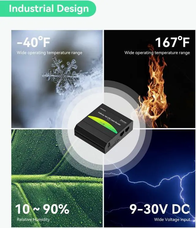 INDUSTRIAL DESIGN -Aluminium housing; Wide voltage input 9-30V DC and wide operating temperature range -40degF ~ 167degF (-40degC ~ 75degC), suitable for harsh environments.