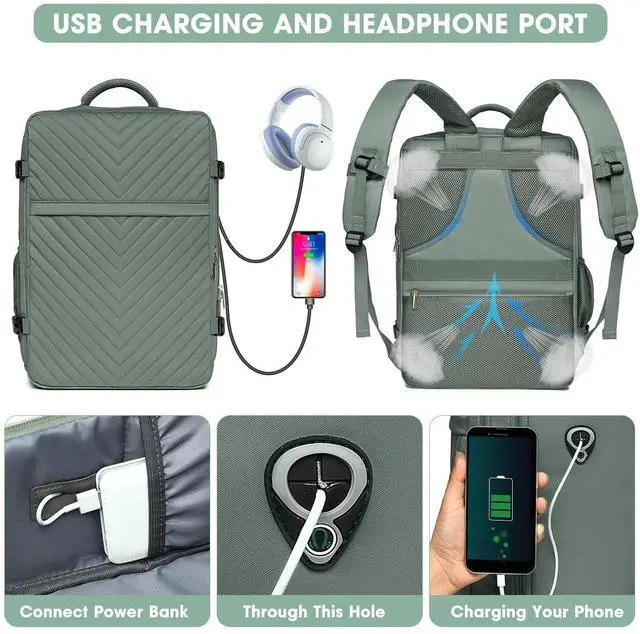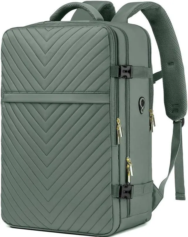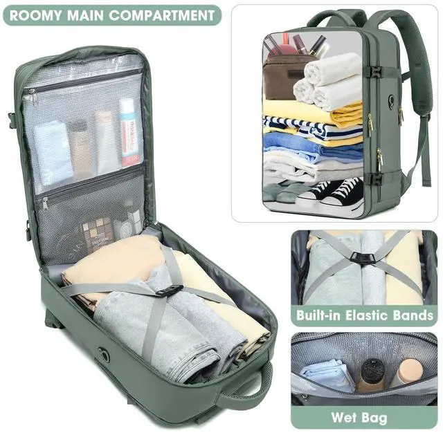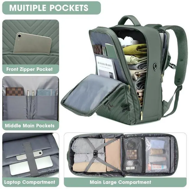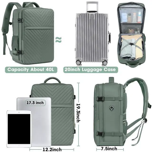 Airplane Approved Travel Backpack - The dimension of green backpack is 19.3 x 12.2 x 7.5 inch. Perfect size for airline approved. 2.56 lbs weight. The capacity is 40L. You can board the plane with this water resistant travel laptop backpack as a personal item and save on paying any extra baggage fees. Two laptop compartments for 13-inch ipad and 17.3-inch laptop. One expanding side pocket for water bottle or an umbrella. The front compartment has many pockets to keep your belongings organized.
