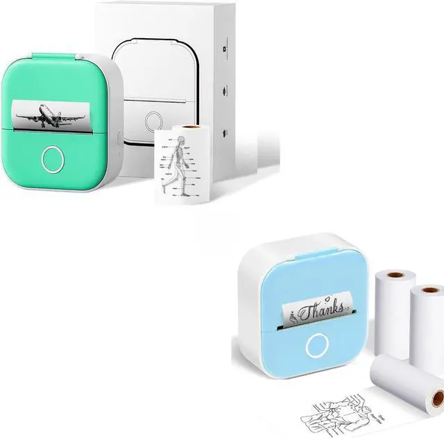 Ponek T02 Green Mini Pocket Sticker Printer (1 Printer + 1 Roll Paper) and T02 Blue Mini Pocket Sticker Printer (1 Printer + 3 Rolls Paper)