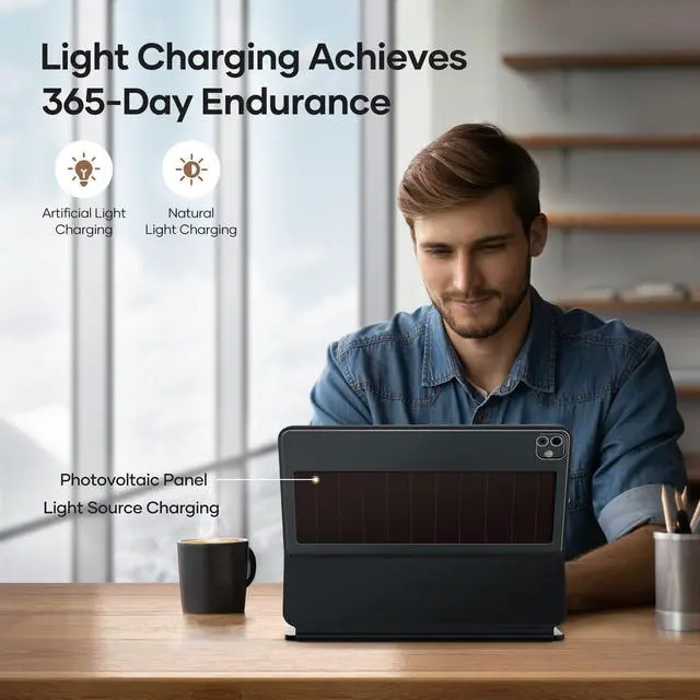 Light Charging: With a photovoltaic panel, keyboard case is automatically charged via light (natural light or artificial light), possessing an extremely long 365-day endurance, eliminating the troubles of forgetting to charge or no cable to charge