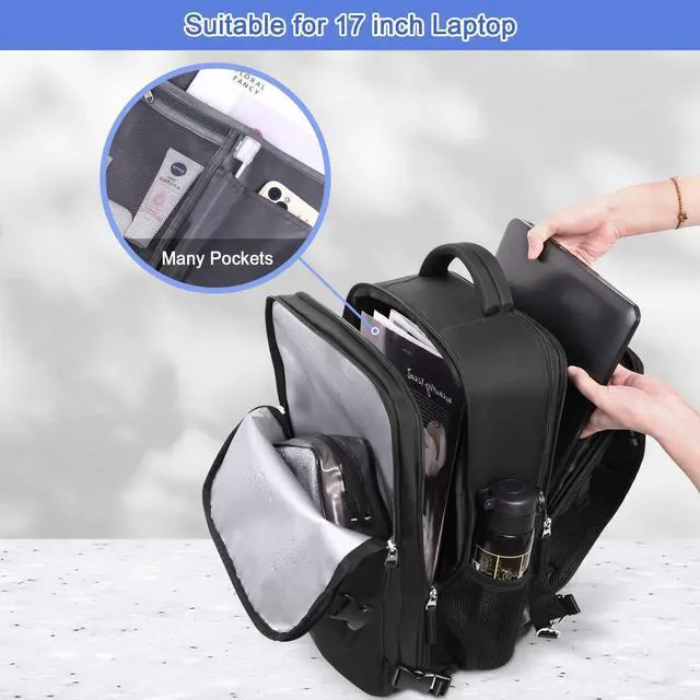 you an easy trip: designed with multiple carrying options like BACKPACK, SUITCASE and BRIEFCASE style. Shockproof The laptop backpack has good thick cushions in both laptop compartment and main compartment to protect laptop and other items inside the backpack. Larger Capacity It is suitable for 17.3 inch laptop. 40L carry-on backpack, which can be used for 3-7 days of travel. Waterproof The overall backpack for travel is made of waterproof fabric to keep you from getting wet in rainy days. Wet Bag There is a dry and wet separation compartment inside, which is convenient for you to store wet clothes. Thickened and Wide Handle The shoulder straps of the travel backpack can be hidden and make the backpack as a briefcase by using the thickened and wide top and side handles. THIS ITEM IS NOT INTENDED FOR USE BY CHILDREN 12 AND UNDER.