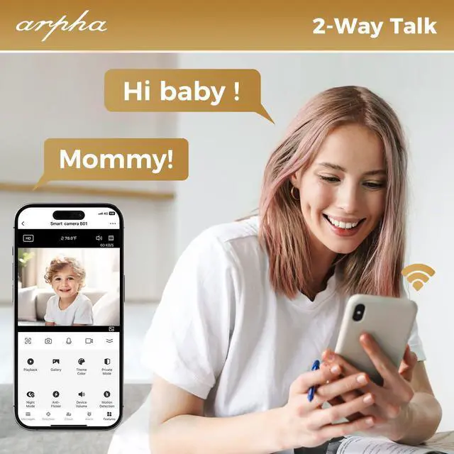 Arpha 1080P Indoor Security Camera, WiFi Camera for Baby Monitor, PIR Motion Detection Temp Monitoring, One Touch Call Two Way Audio, Night Vision 355deg Pan, Night Lamp Alarm Clock