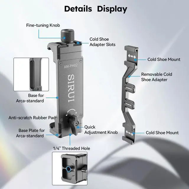 Universal Compatibility: The SIRUI AM-PH02 tripod holder for iPad features an adjustable opening range of 3.94"-9.25"/10-23.5 cm, making it suitable for both smartphones and tablets. It is compatible with various devices, including but not limited for iPad Pro, for iPad Air, for iPad Mini, and other tablets from other brands