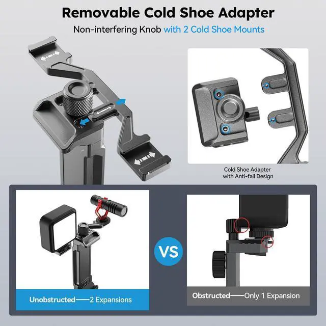 Detachable Cold Shoe Mount: The tablet mini holder kit includes a unique detachable cold shoe adapter, allowing you to choose whether to install it based on your needs, offering both functionality and a sleek design. The cold shoe adapter can simultaneously support two photography accessories, such as microphones, flash units, or LED lights