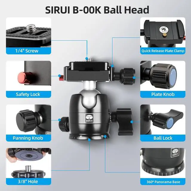 ^^ 360 Panning Base - Tripod head provide smooth operation for 360 Panning. With engraved index marks, it help you to know where you are each time when you want to do a manual panorama with your camera. ^^ Wide Compatibility - This low profile ball head has a quick release plate with a 1/4 inch screw and a 3/8 inch female thread at the bottom, it fits most DSLR cameras, camcorders, heavy duty binoculars, camera sliders, etc.
