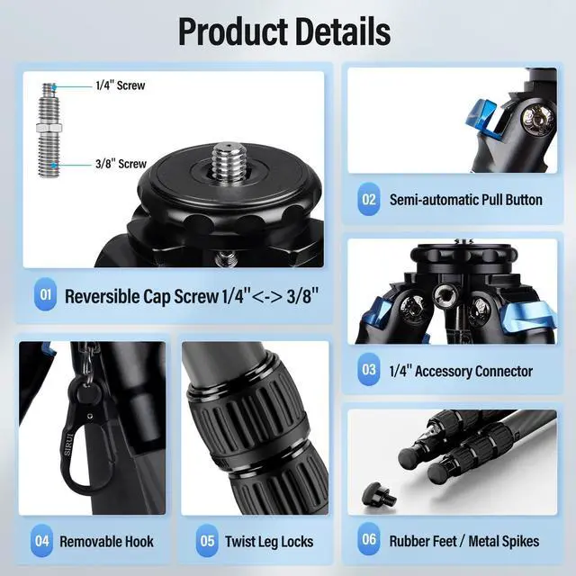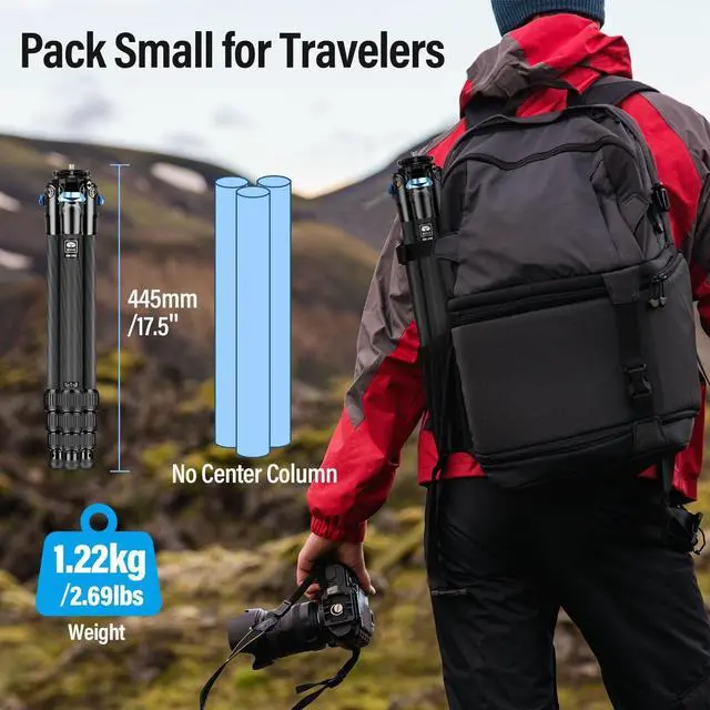 Portable and lightweight, camera tripod legs made of carbon fiber weights only 2.69lbs, making it a perfect companion for outdoor shooting with a carry bag.