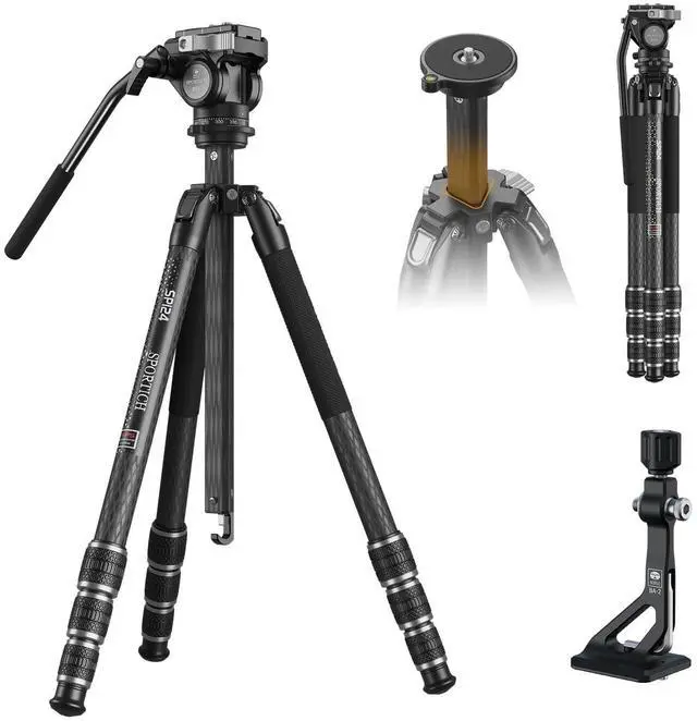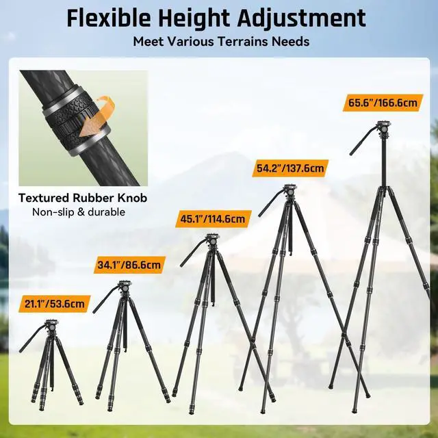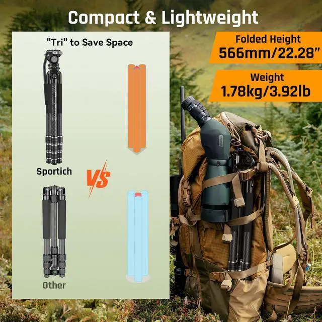Carbon fiber construction - Lightweight but strong carbon fiber sections provide ultimate stability for your binoculars or monoculars. The max tubes diameters is 26.5 mm/ 1.04 inch, enhance the strength of the carbon layers. The SP124 tripod weight is only 2.6 lbs but max load up to 26.5 lbs, which is an ideal companion for hiking, backpacking, and travel photography in rugged environments. ^^ Easily Adjustable Height and Angle - 4-section legs and triangle center column is designed to quick set-upviewing height from 37.5 cm/ 14.8" to 158cm/ 62.2". Semi-automatic angle-selector for 3 fixed angle adjustment-22, 55, 85 degree.