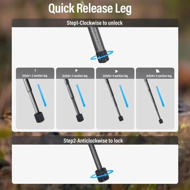 INNOVATIVE QUICK-RELEASE LEG SYSTEM: Say goodbye to multiple twist locks! The SIRUI Traveler X features a single twist lock mechanism that allows you to fully extend or retract its 5-section legs in just 2 seconds. This innovative design saves time, helping you capture every shooting or hunting moment with ease.
